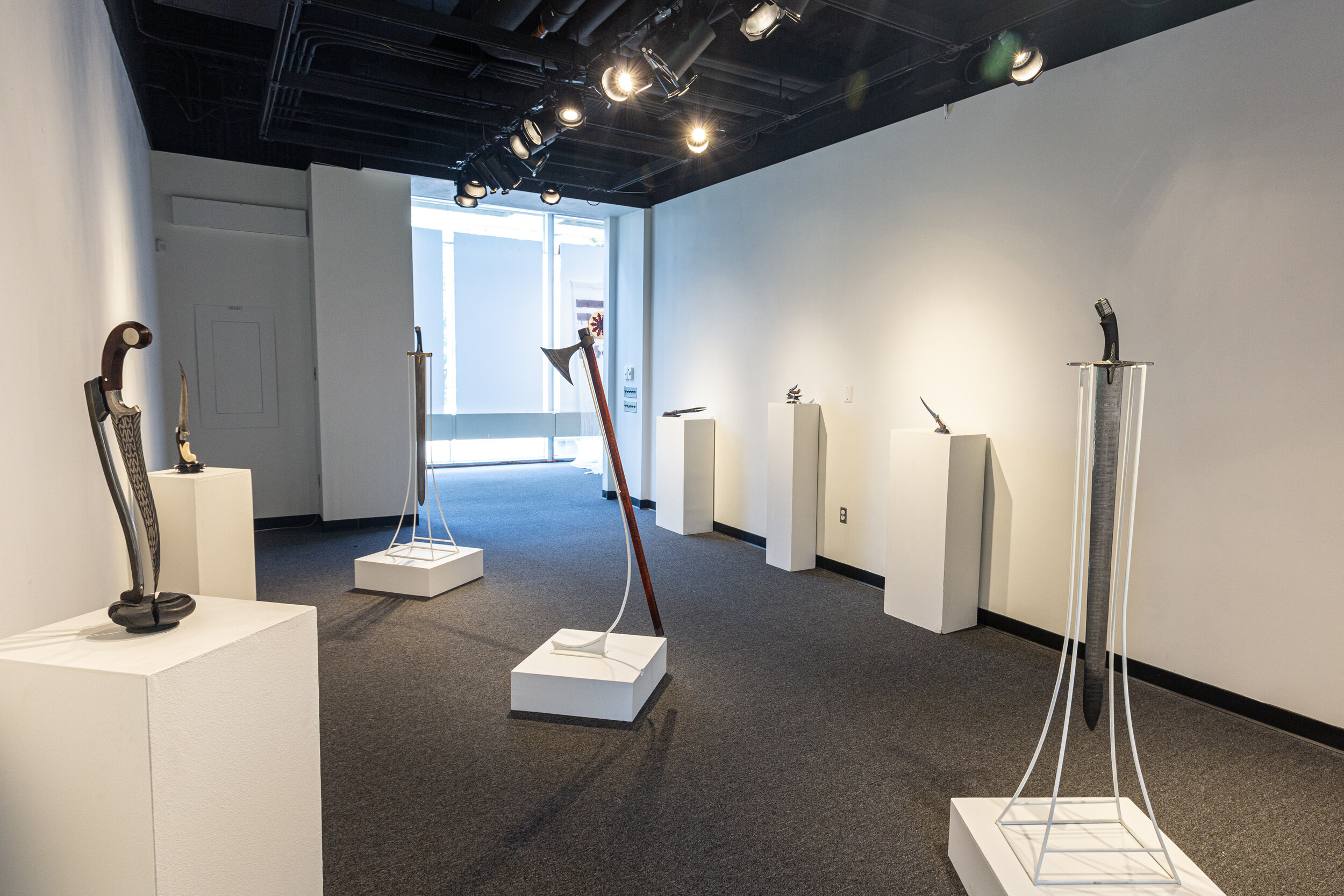 As these works reference hypotheticals and the non-existent, they become objects of no particular time or place; their original purpose is known and respected, but almost never obeyed. The edged weapon has no role in the daily modern world, and while it can still be found in rituals around the globe, it is not the feature of daily life that it once was. These blades can now be appreciated in their many roles, free of the moments and emotions they formally existed in. Protection, projection, violence, righteousness, or fear, these primal reactions are understood implicitly, although now quietly inactive, like a retired prizefighter.