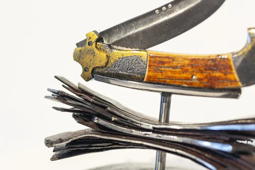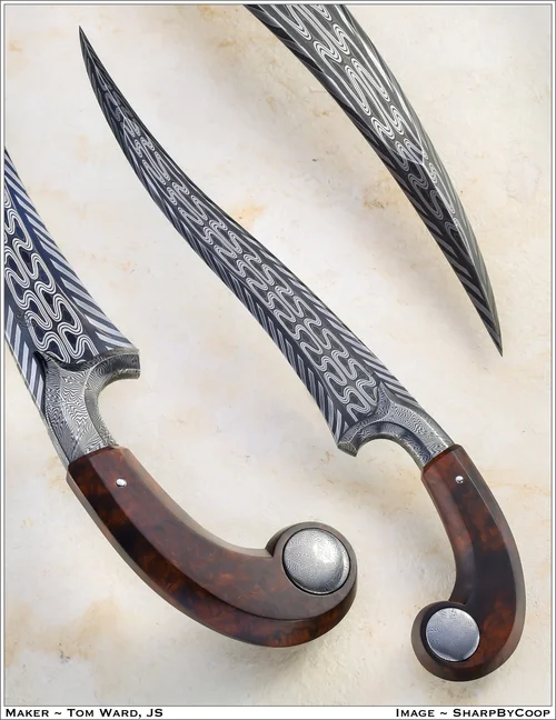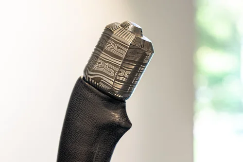 Throughout my work, I have used a modern approach to materials that have given me the freedom to combine processes from around the globe, only available to me in this age of infinite information, and this is what keeps my work connected to the world of today. This also hastens my own processes of innovation and understanding. My ability in pattern welding far exceeds the ancients in terms of pattern complexity and the predictability of outcomes. Although ancient steel had higher plasticity, making some ancient patterns nigh unachievable in modern steel. With modern metallurgy and machinery, I am able to replicate and innovate at rates unachievable by entire workshops of the distant past. Crucible steel, on the other hand, was better understood in ancient times than it is now, so the modern approach to that material is still limited and confusing, but I have had some success working with that as well. The menu of processes and materials that I have at my disposal spans the entirety of human history, ranging from modern precision machining to the use of ancient fossilized mammoth ivory like that of the 40,000-year-old Vogelherd Cave sculptures.